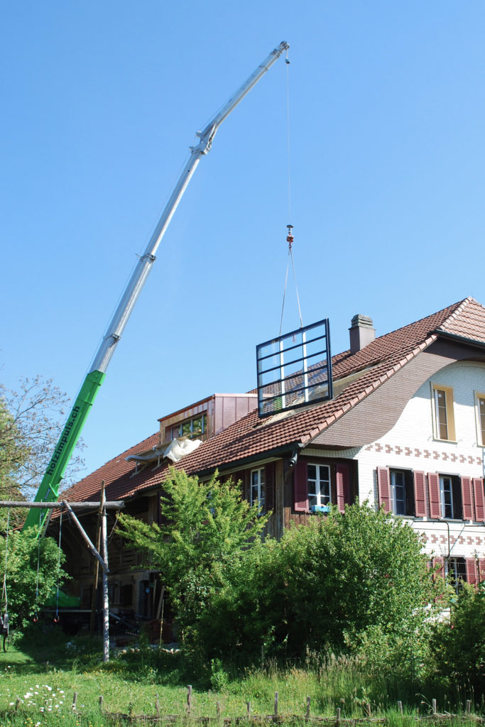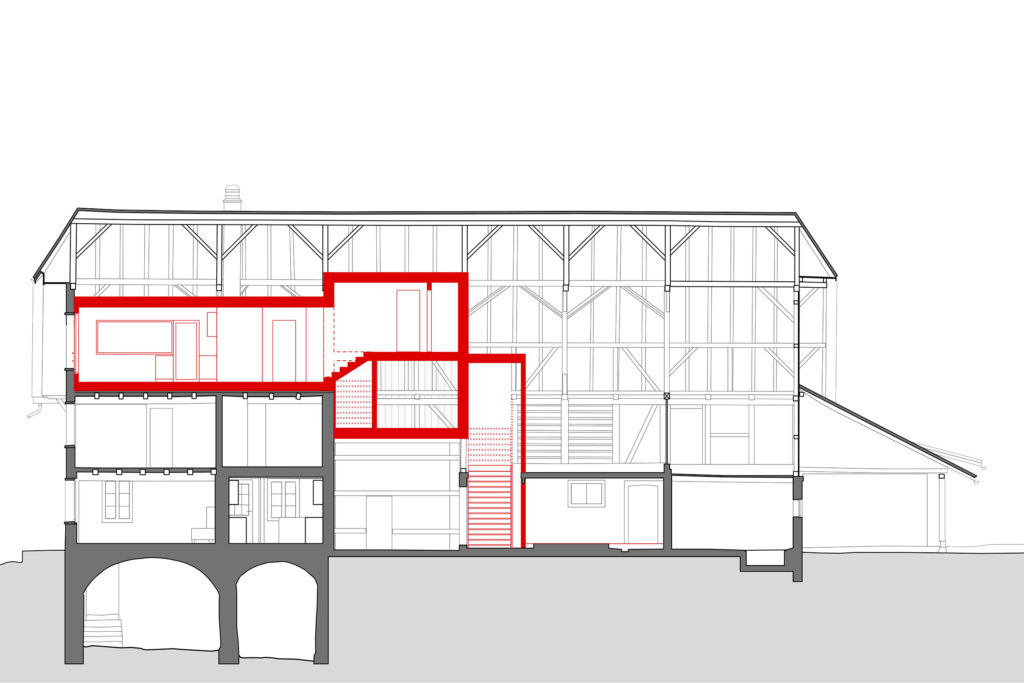 Durch den Ausbau des Söllers, dem ehemaligen Heustock, wird ein zusätzlicher Wohn- und Arbeitsraum realisiert. Der Wohnraum wird durch einen loggiaartigen Aussenraum erweitert. Das Lamellenfenster im Dach reguliert die Belichtung und die Belüftung der Loggia. Die zentral angelegte Erschliessung liegt im Ökonomieteil und führt zur Wohnung und dem darunterliegenden Atelier.