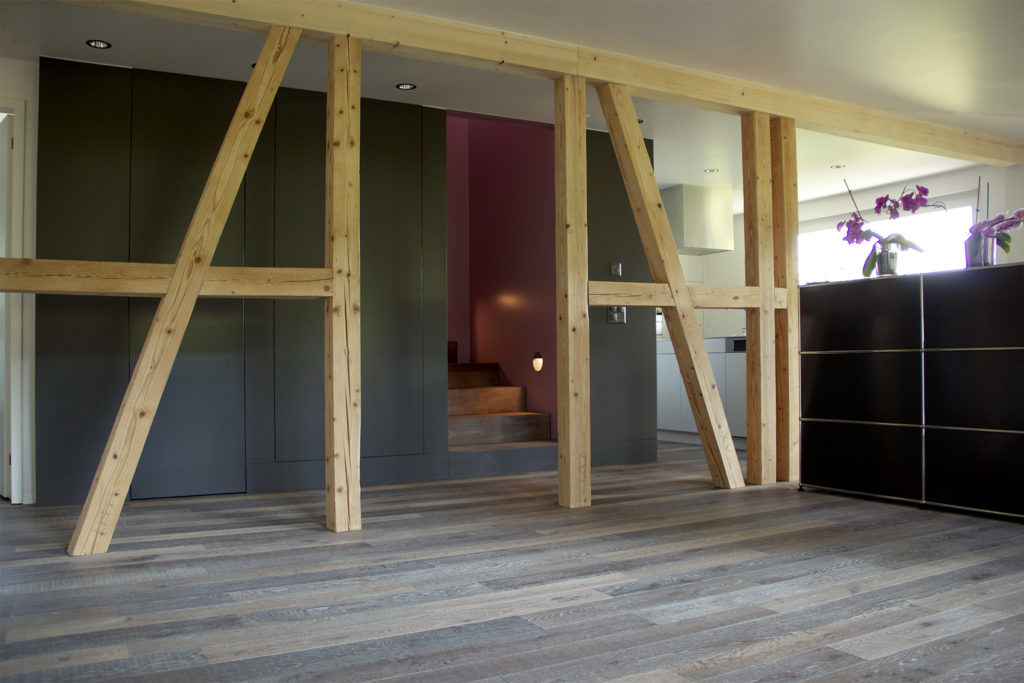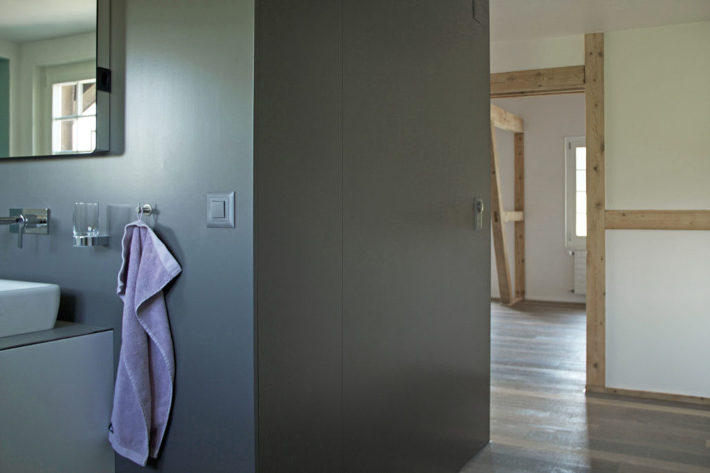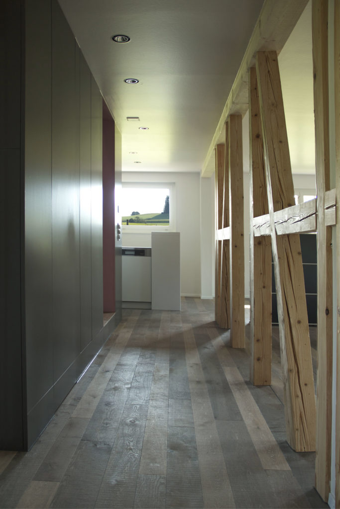 Das aus den 1950er – Jahren stammende Einfamilienhaus wurde renoviert und einer energetischen Sanierung unterzogen. Die neu interpretierte, vertikale Erschliessung wird im Innenraum als Box gelesen und steht mit seiner zeitgemässen Formensprache im Kontrast zu der sorgfältig restaurierten Holzkonstruktion.